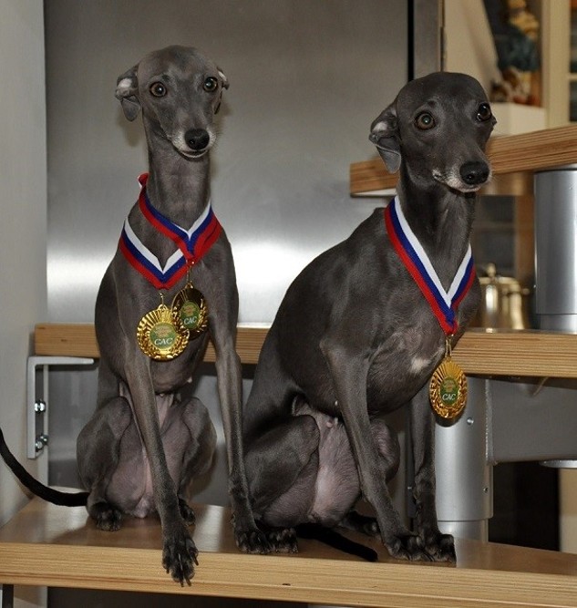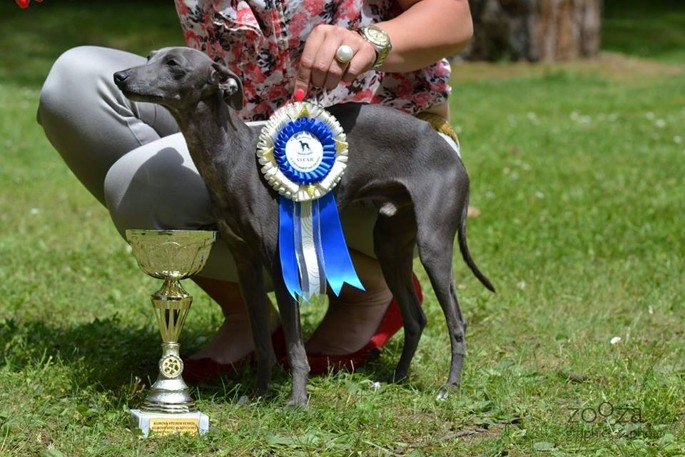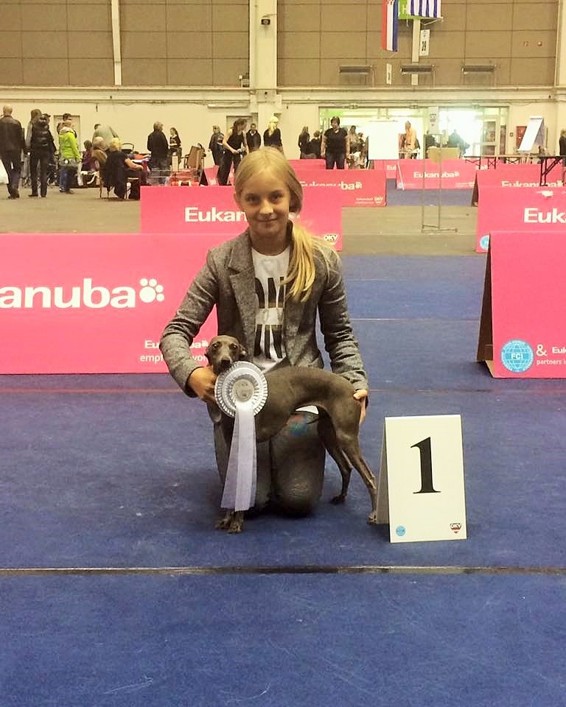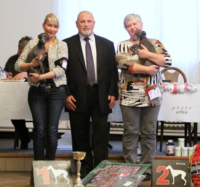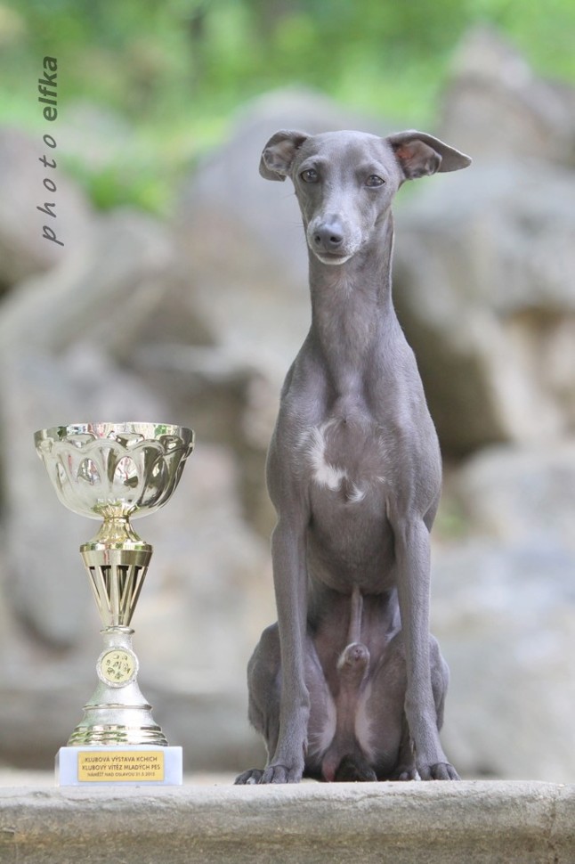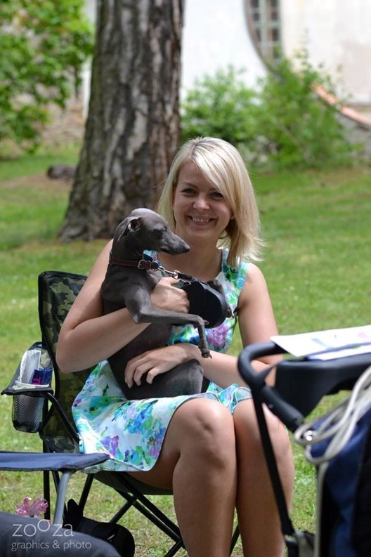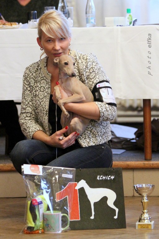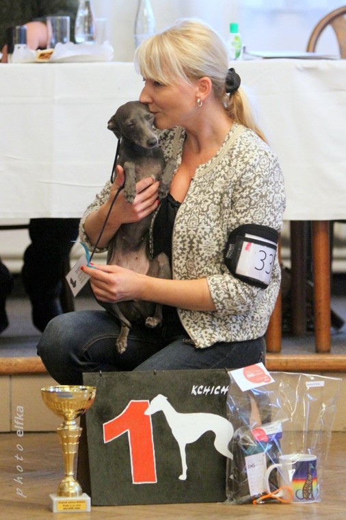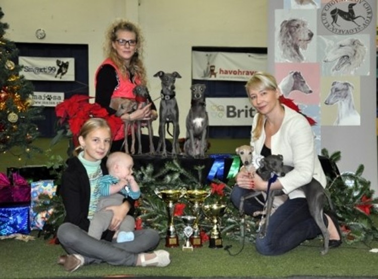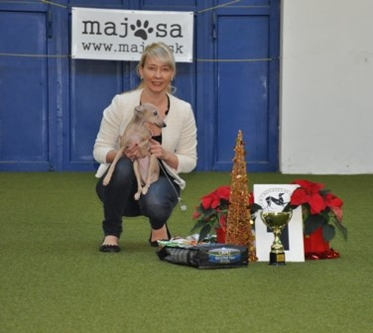 Francesca měla trošku problém s podlahou a ne jenom ona. V hale byla položena umělá tráva a nožky se chrtíkům bořily do měkkého. Francesca kdyby mohla létat, tak je asi motýl, takže na to jak se nepředvedla získala nádherné ocenění V1, CAC, KLUBOVÝ VÍTĚZ. V závěrečných soutěžích to maximálně bojkotovala a já měla pocit, že za sebou táhnu oslíka a ne elegantního italského chrtíka. I takhle se naše Franča umí chovat :-) Byl to pohodový den zakončený společnou fotografií s Bárou, Natálkou a Alexíkem, v letošním roce novým členem našeho týmu :-)