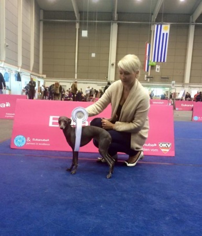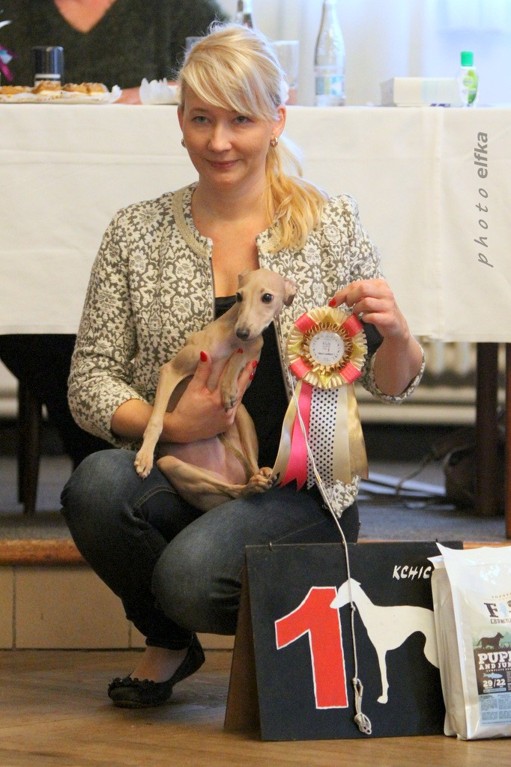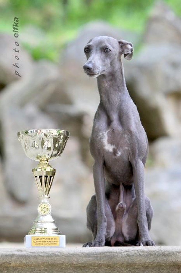 Bertuccia se předvedla ve třídy štěńátek, ještě s jednou importovanou krémovou chrtí slečnou, získala vcelku lehce VN1 a tím si otevřela cestu do závěrečného kruhu, kde se soutěžilo o nejkrásnější štěńátko všech chrtích plemen celé výstavy. BIS BABY posuzoval druhý posuzující pan rozhodčí M.Sistermann (D), proto jsem předpokladála že BIS neboli první místo poputuje většímu plemeni a ne malému italáčkovi. Byli jsme velmi potěšeni, když BIS BABY získala naše Bertuccia.
